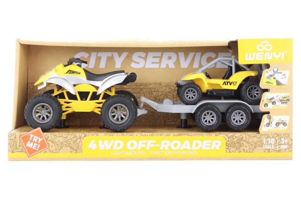Plastová štvorkolka s vlekom a buginou.