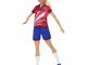 Futbalová bábika Barbie (cca 29 cm) v červenom drese, ktorý sa skladá z červeného trička s bielym pruhom, číslom „9“ a tímovou nášivkou a modrých šortiek, kopačiek a vysokých bielych ponožiek.