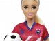 Bábika Barbie futbalistka má tiež blonďavý cop a dodáva sa s futbalovou loptou.