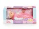 Bábika má roztomilé ružové oblečenie s obrázkom unicorna na prednej strane a pruhovanú čiapočku, ktorá ladí s rukávmi overálku.