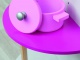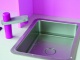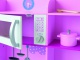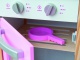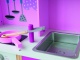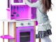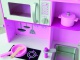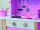 Drevená kuchynka ružovej farby pre malé kuchárka. Má otočnú drezovú batériu, otváracie dvierka a otočné gombíky u elektrickej i mikrovlnnej rúry.