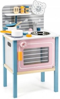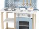 Drevená kuchynka modrá so sporákom, rúrou a drezom.