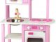 Drevená kuchynka, ktorá je ladená do bielej a ružovej farby je pripravená pre dievčatká, ktoré rady pripravujú jedlo, napríklad pre bábiky.