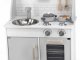 Drevená kuchynka sivá so sporákom, rúrou a drezom.