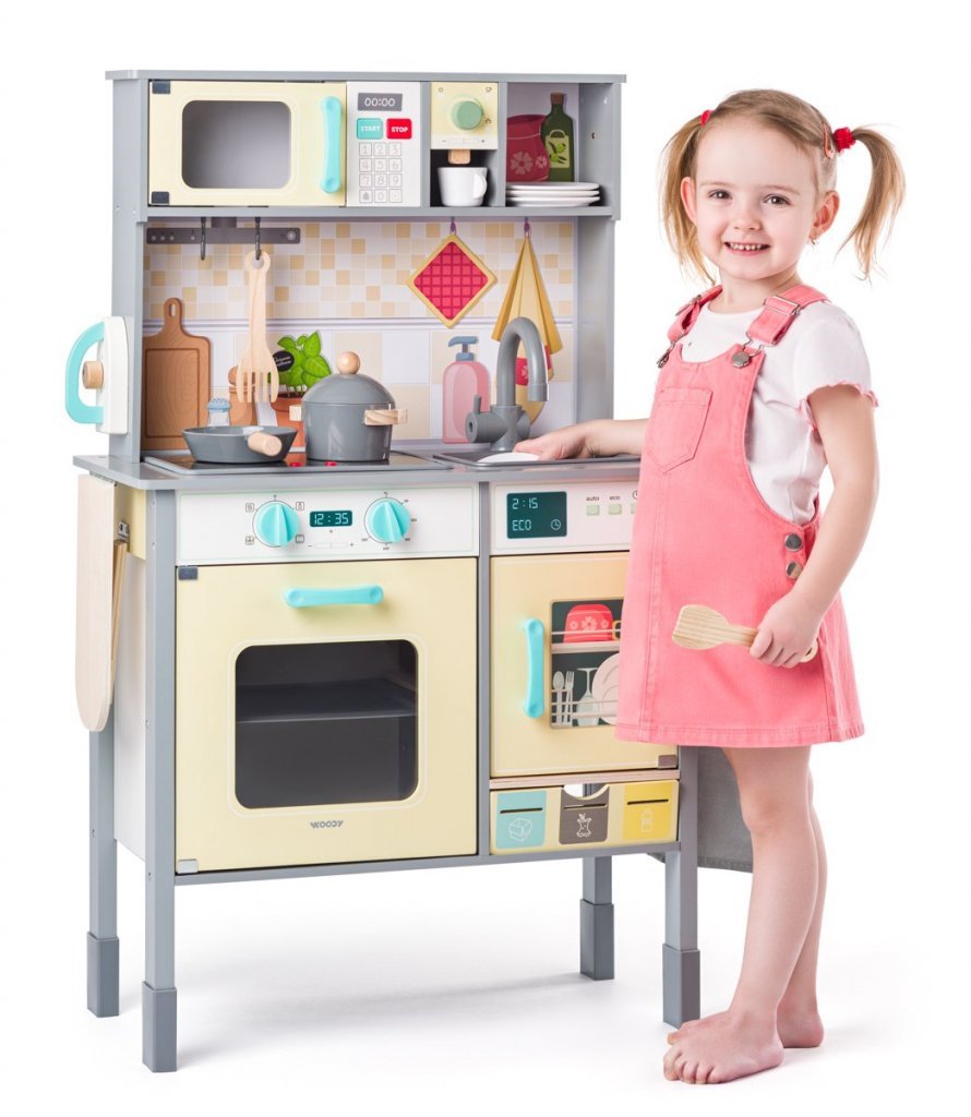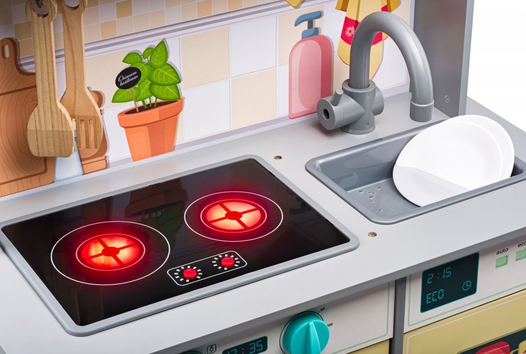 Z čelnej strany obsahuje rúru, mikrovlnku so svetlom a zvukom, kávovar, umývačku, drez aj varnú dosku s červeným podsvietením a zvuky reálneho varenie.