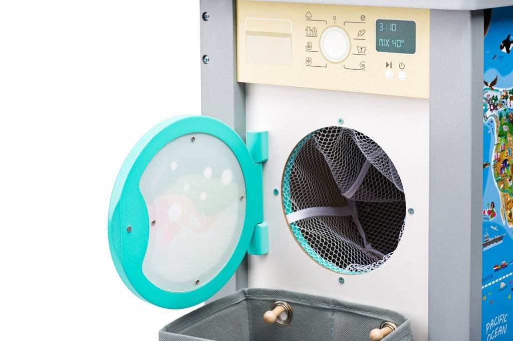 Z pravého boku nájde dieťa práčku s košom na bielizeň, z ľavého boku potom žehliaca doska s žehličkou.