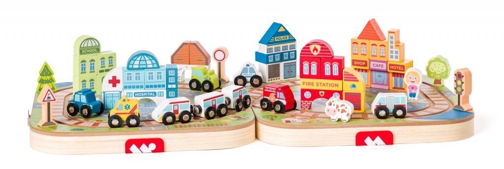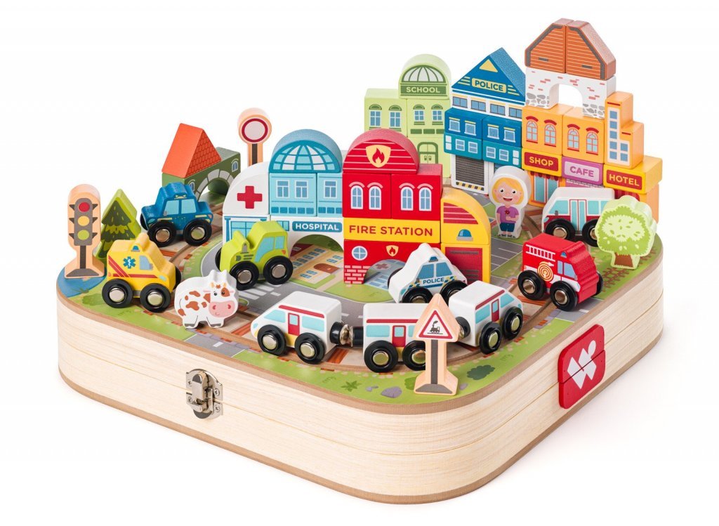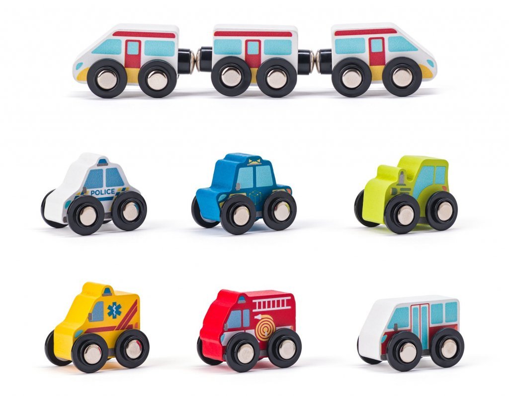 Drevený vláčik, drevené autíčka a kocky na stavbu domčekov tvorí dokonalú hernú sadu v jedinečnom dizajne od slovenskej výtvarníčka.