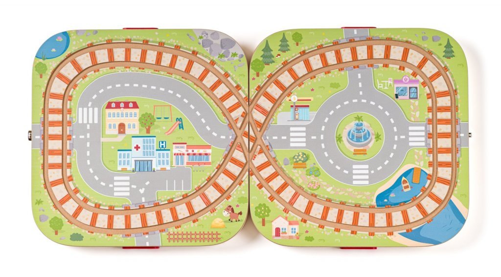 Po jeho rozložení vznikne na oboch stranách jeho veka krajina s dráhou v tvare osmičky s vyfrézovanými koľajami.