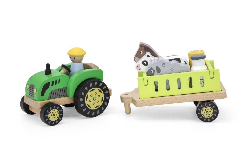 Drevený traktor s prívesom o veľkosti cca 23 × 7 cm, príves je možné odpojiť.
