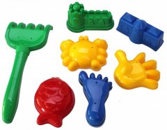 Sada záhradník obsahuje kanvičku, motyčku, kliešte záhradné, kvetináč, lopatku, rozprašovač, bager na zasievanie, stromček.