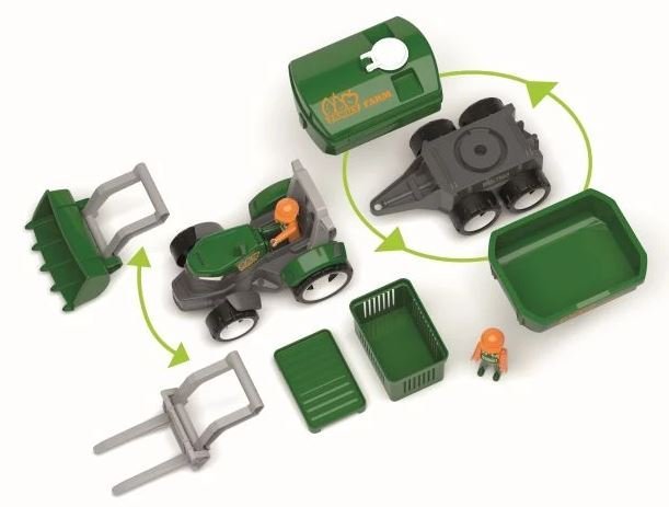 Ideálna sada pre malých farmárov. Obsahuje: traktor s vymeniteľnou radlicou/nakladacími vidlami, príves s dvoma náhradnými korbičkami cisternou a valníkom a 2 Igráčky poľnohospodárov.