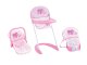 Detská sada jedálenské stoličky s látkovám sedom, autosedačky a nosidlá. Stolička o váhe 0,51kg, rozmer stoličky 31 × 28 × 52cm, šírka sedáka 22cm. Autosedačka o váhe 0,27kg, rozěmr 37 × 24,5 × 16cm, vnútorná sedák 17cm, plastová škrupina a látkový sedák. Látkové nosítko. všetko pre bábiky do cca 43cm.