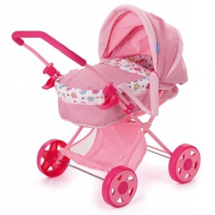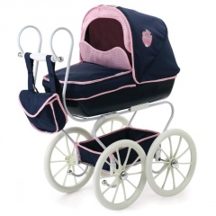 Klasický detský kočík pre bábiky v ružovej farbe s bodkami.