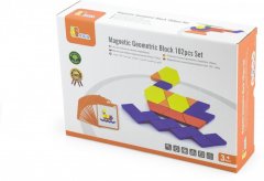 Drevený kufrík s magnetickými kockami obsahuje 42 kociek a 12 kariet s 24 kombináciami, do ktorých je možné umiestniť kocky.