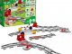 Obsahuje rovný diel koľají a 10 dielov zákrut, navyše 2 zastávky, 2 výhybky, prejazd a červenú akčné kocku, vďaka ktorej vláčik zastaví.