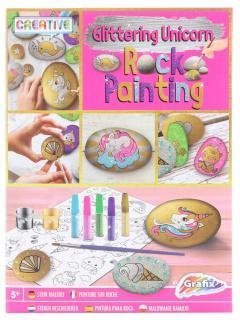 Sada na maľovanie kamienkov obsahuje 4 kamene, 5 farieb, 1 štetec, 2 trblietavé farby v tube, samolepky a návod.