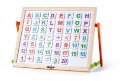 Z jednej strany je čierna magnetická tabuľa, na ktorú je možné kresliť kriedami az druhej strany je biela tabuľa na ktorú je možné kresliť fixou.