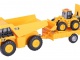 Caterpillar (CAT) veľké nákladné auto so sklápacou a prívesom s malým bagrom.