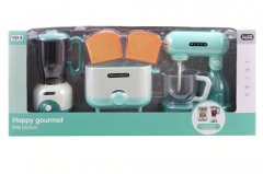 Súprava kuchynských spotrebičov na batérie, ktorá obsahuje mixér, šľahač a hriankovač.