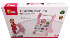 Drevené chodítko s hernými prvkami na rozvíjanie detskej chôdze a motoriky.