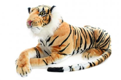 Veľký plyšový tiger s rozmermi cca 70 × 30 × 30 cm, merané bez chvosta.