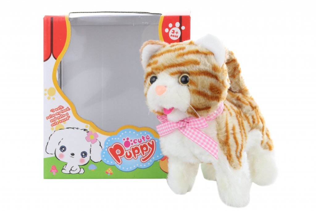 Ryšavá chodiaca mačička, ktorá vydáva zvuky a chodí.