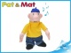 Plyšový kutil Pat oblečený do svojho typického žltého trička a modrej čepce.