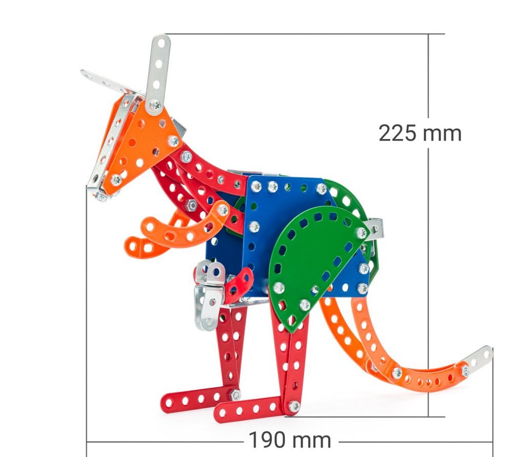 Stavebnica obsahuje kvalitné kovové diely, ktoré sa ľahko spájajú skrutky, čo podporuje rozvoj jemnej motoriky, logického myslenia a sústredenie.