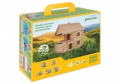 Drevená slepovacie stavebnica obsahuje drevené hranoly daných dĺžok k stavbe zrubových stien, diely na strechy a štíty, kartónové výseky okien a dverí aj predtlačené papierové potlačami.