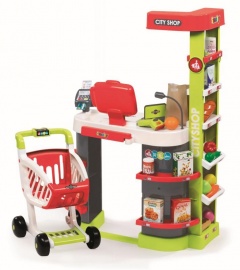 Obchodík s radom priehradiek, váhou, mikrofónom, čítačkou platobných kariet, nákupným košíkom a ďalším príslušenstvom.