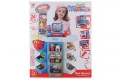 Plastová kaviareň obsahuje kávovar, chladničku s tromi donutmi a ďalšie doplnky.