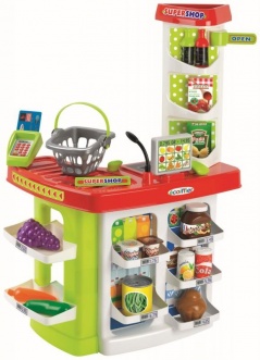 Smoby supermarket s elektronickou pokladňou s LCD displejom, s integrovanou kalkulačkou, so skenerom s funkciou zvukového signálu a svetla, nastaviteľnými hodinami a množstvom príslušenstva.