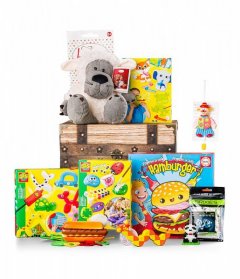 Truhla obsahuje celé spektrum zábavy pre chlapcov: montovanie, stavanie, hru s autíčkami, nebezpečného dinosaura aj plyšové maznanie a hrnček na raňajky.