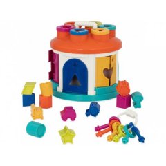 Drevená kocka s deviatimi rôznofarebnými vkladacími tvary, ktoré zodpovedajú otvorom v stenách kocky.