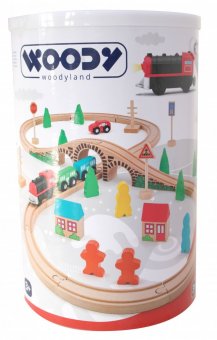 Detská drevená lokomotíva s držadlom na kolieskach Woody. Ktoré dieťa by rado nepozoroval vlaky?